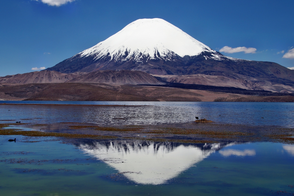 Wulkan Parinacota (6348 m n.p.m.) na północy Chile odbijający się w jeziorze Changara